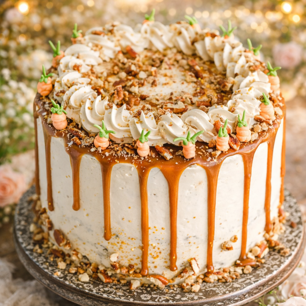 Exquisita torta de zanahoria artesanal, preparada con bizcochos húmedos y esponjosos, elaborados con zanahoria fresca rallada, especias suaves y un toque casero que realza su sabor natural.