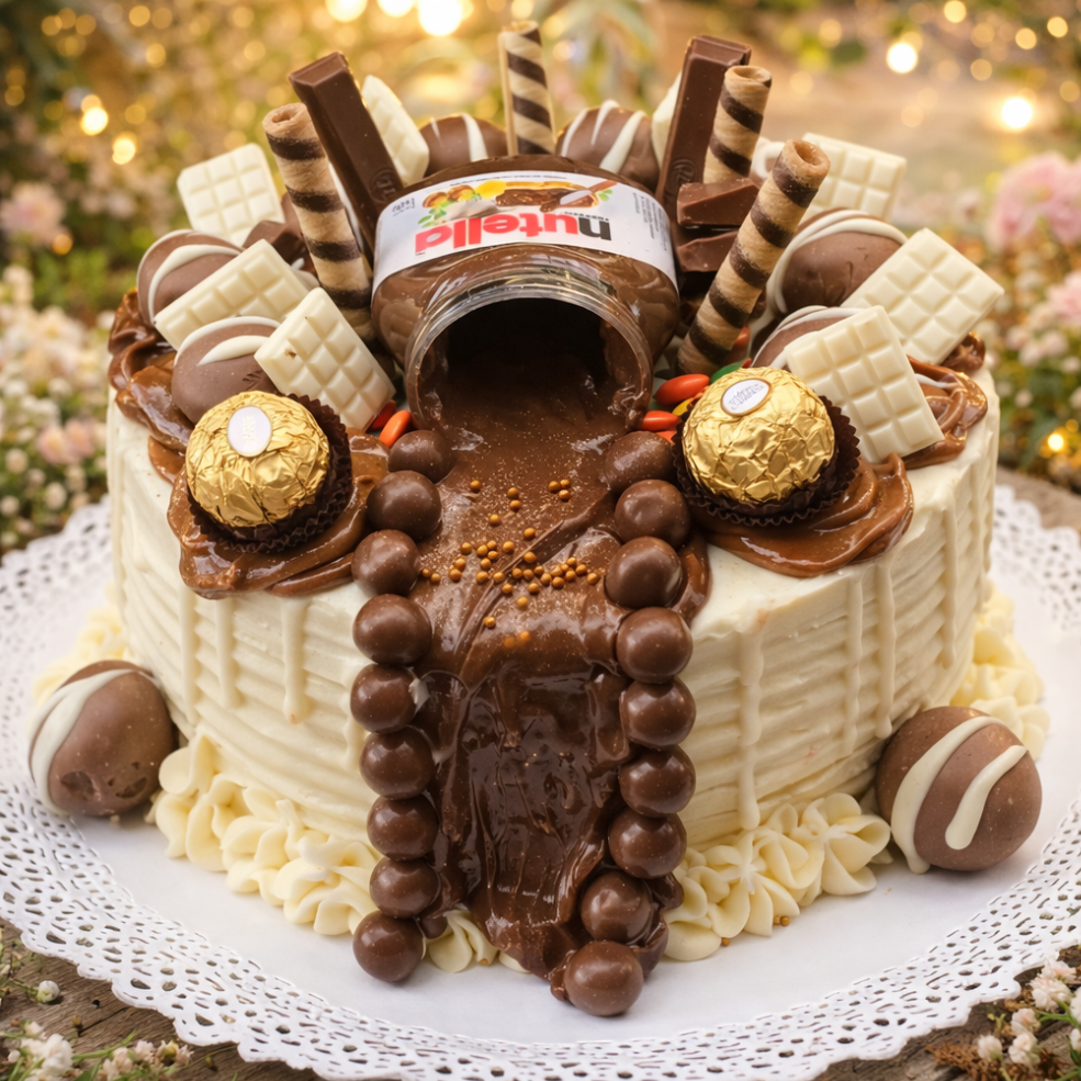 Bizcocho esponjoso con dos rellenos a elección, cubierto con ganache de chocolate blanco y decorado a mano con drip de chocolate, nutella original, ferrero rocher y selección de chocolates premium