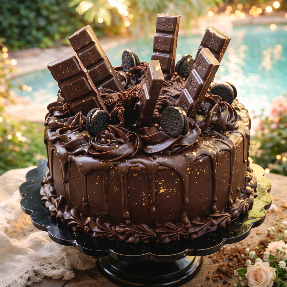 Bizcocho esponjoso relleno con dos rellenos a elección, cubierto con suave buttercream de chocolate y decorado a mano con drip de chocolate, barras de chocolate Milka, galletas Oreo, rosetones de crema de chocolate y detalles dorados.